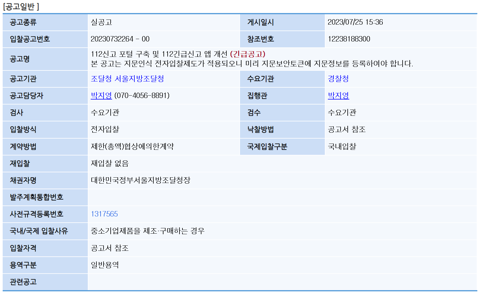 공고기관 : 조달청 서울지방조달청 수요기관 : 경찰청 | 공고일시 : 2023/07/25 입찰공고번호 : 20230732264 - 00